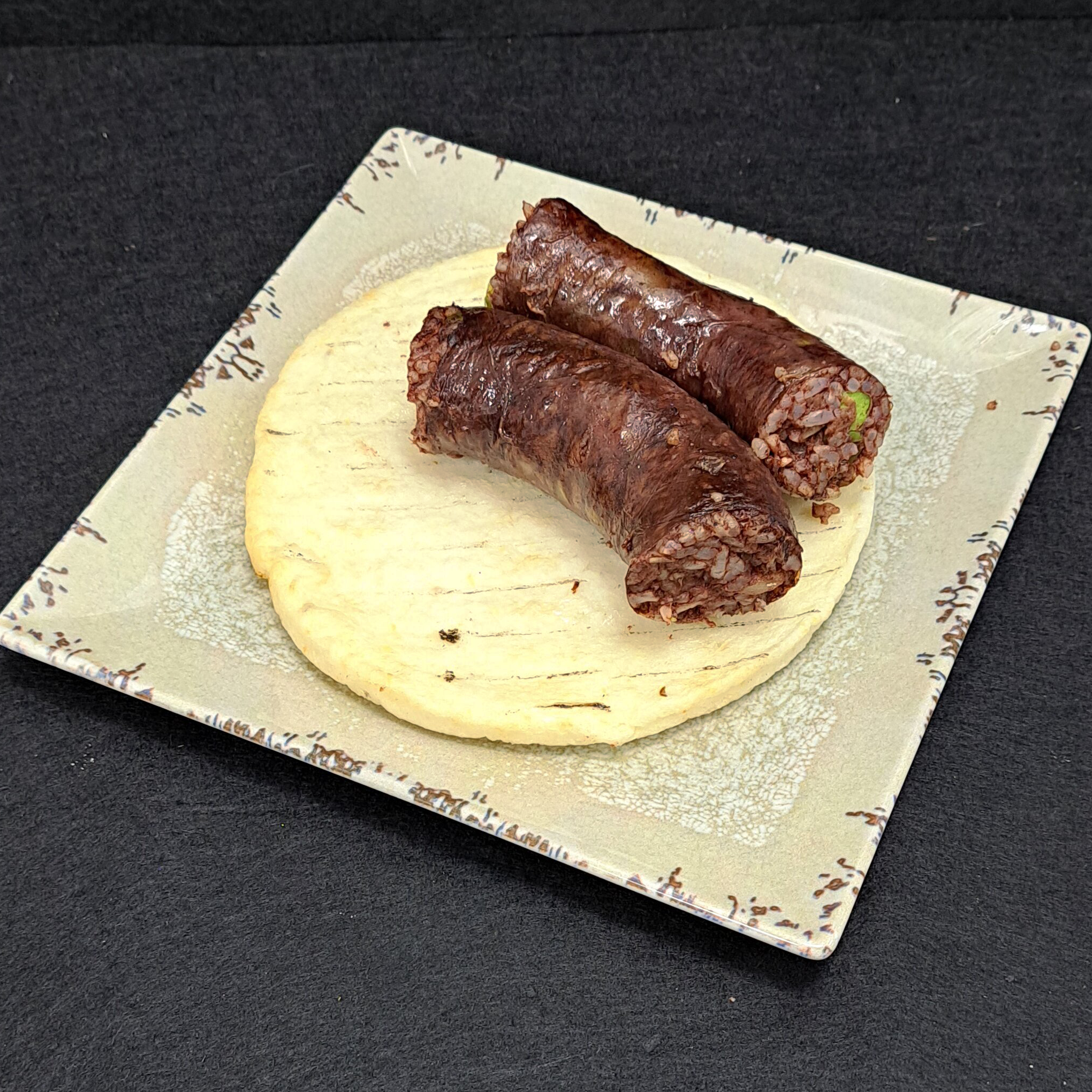 Nuestra morcilla colombiana es el resultado de una receta tradicional que ha sido perfeccionada a lo largo de los años. Cada pieza se elabora con ingredientes frescos, especias y condimentos que realzan su sabor robusto y su textura única. Desde el primer mordisco, te sentirás transportado a una celebración en Colombia, con una mezcla de sabores que deleitarán tu paladar. La morcilla se complementa de manera ideal con nuestra arepa de maíz blanco, que se cocina hasta alcanzar la textura perfecta: dorada por fuera y suave y esponjosa por dentro.